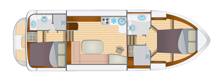 Das Cruiser Premium Steel 4-6 Pers verfügt über 2 Kabinen und einen großen Wohnbereich. Es wird eine Familie oder 2 Paare beherbergen. Dieses Boot fährt ohne Lizenz!