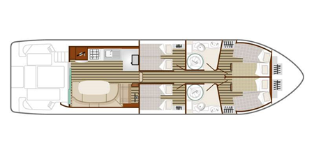 - 4 Kabinen, 4 mit einzelbetten umwandelbar in Doppelbett, 2 Etagenbetten in den vorderen Kabinen